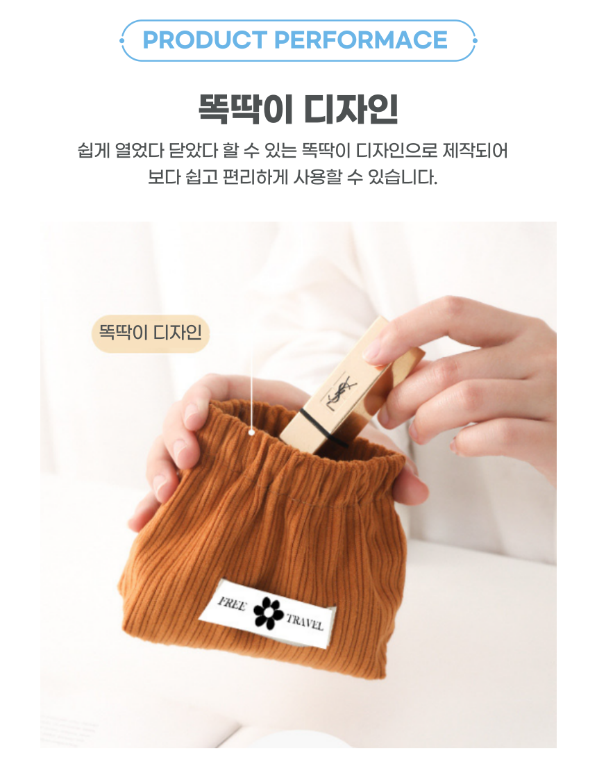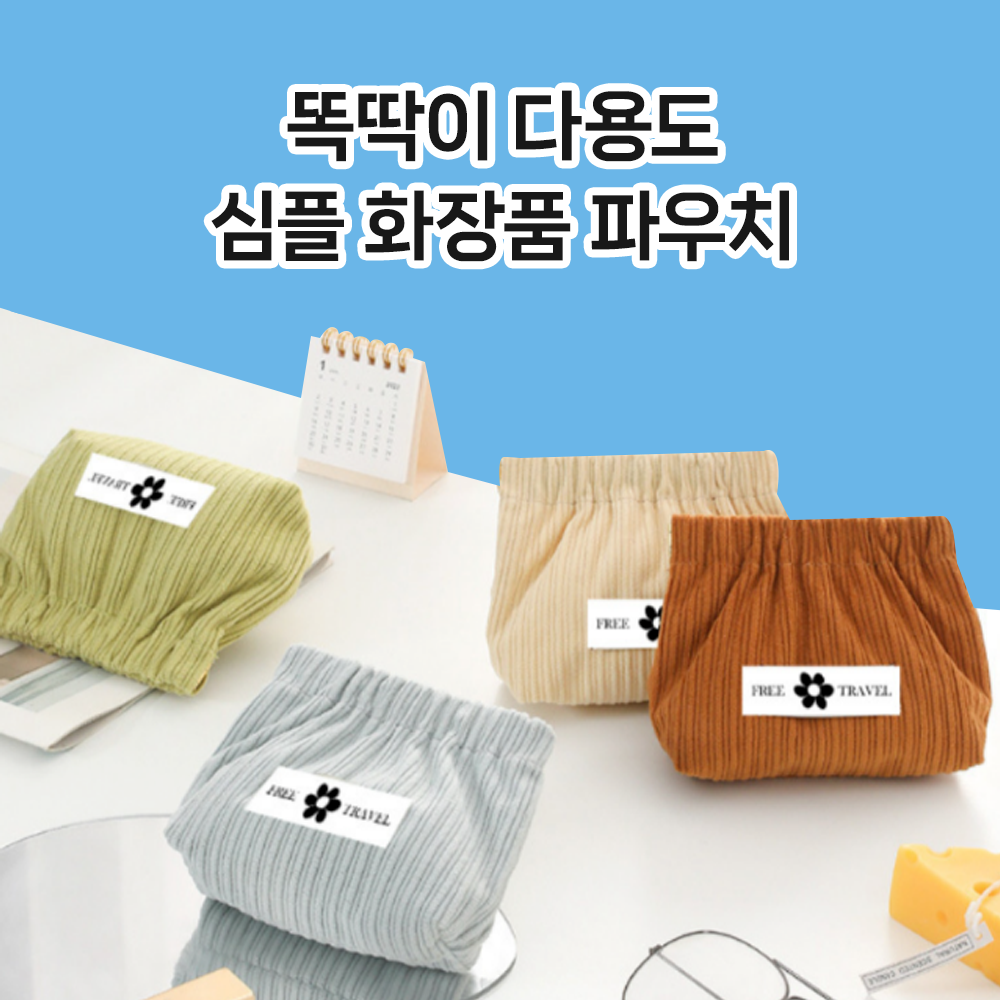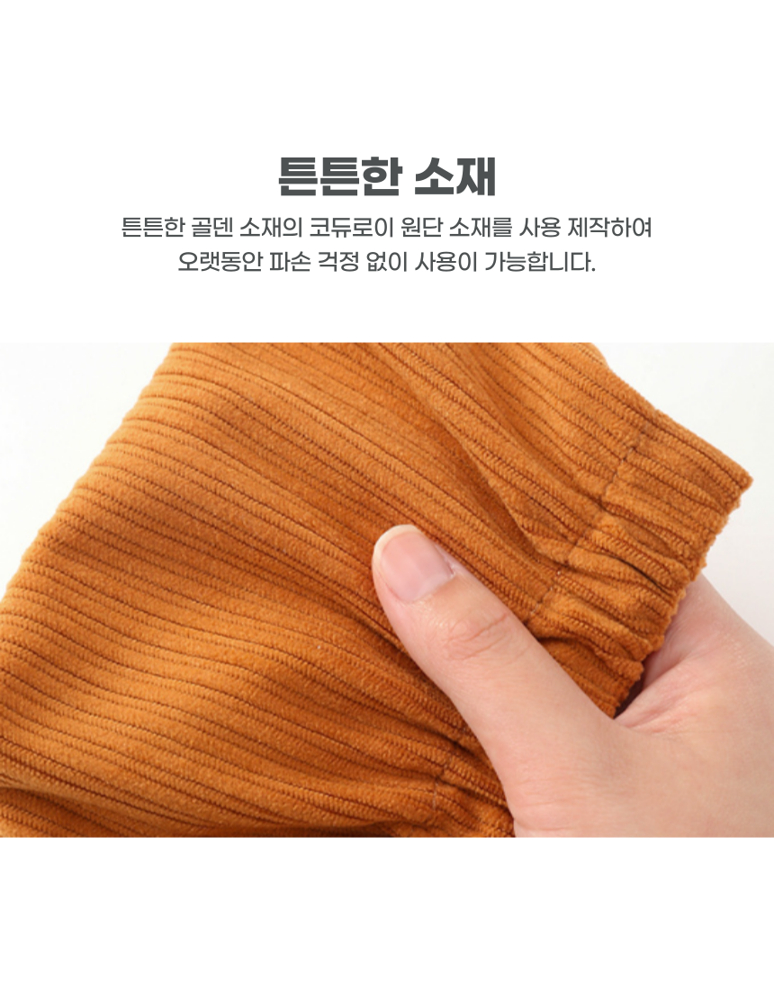 쉽게 열고 닫을 수 있는 똑딱이 디자인, 튼튼한 코듀로이 원단 소재의 파우치